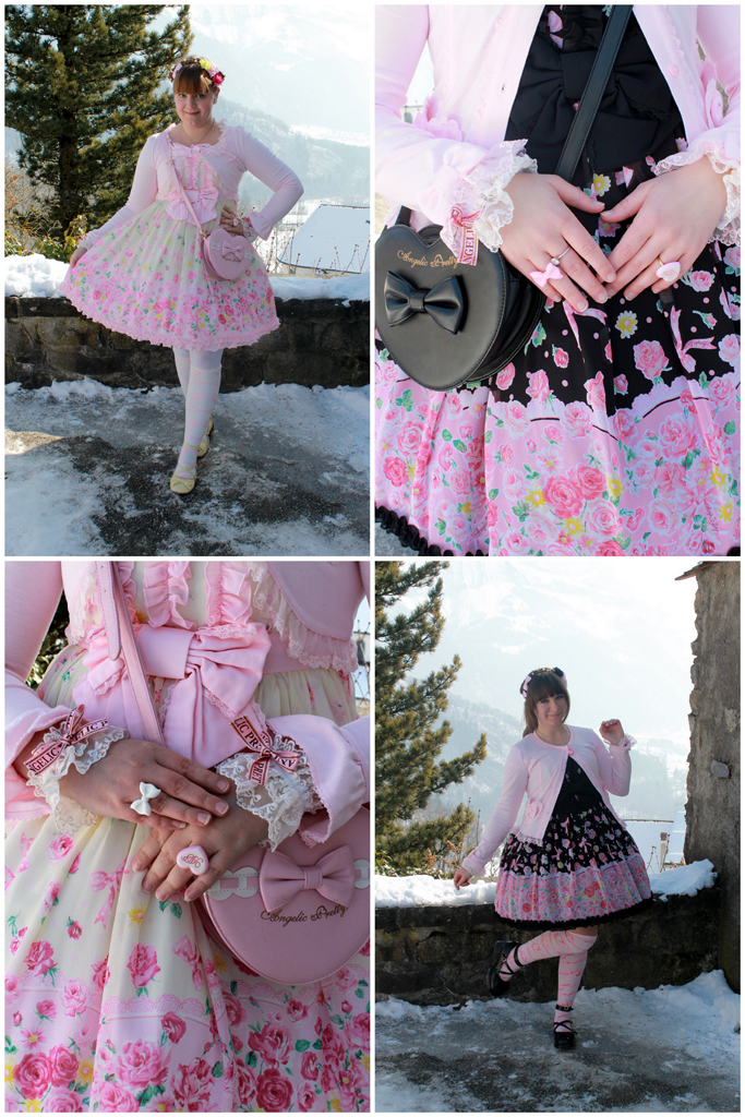 On Wednesday morning we woke up on time, for we were going to Gruyères! At the time I had no idea what it was exactly, except for the fact it was a nice town, great for pictures. We had breakfast and got dressed in basic outfits to get our hair and make-up done. The night before we had coordinated our Lolita outfits for this day. We had decided to wear our Powder Rose jumperskirts, which Emilie has in yellow and I have in black! We coordinated our dresses with pink, flowers and items we had in common, like our wristcuffs. I had also bought Emilie a pink macaron necklace as a gift and because I had bought myself one too to match, we put the necklaces in the outfit too.
